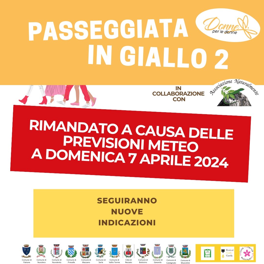 Causa maltempo, la prevista Passeggiata in giallo, programmata per domenica 10 marzo con partenza alle ore 14 dal Santuario della Madonna di Valverde, è rimandata a domenica 7 aprile 2024