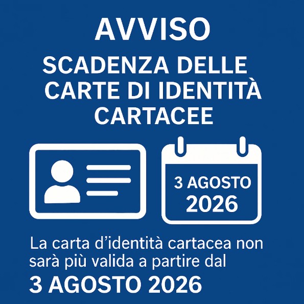 A decorrere dal 3/08/2026, la carta d’identità cartacea non sarà più valida né utilizzabile in nessuna forma, pertanto si invitano tutti i cittadini in possesso di carta d’identità cartacea in corso di validità, a provvedere alla sostituzione della suddetta richiedendo la carta d’identità elettronica.