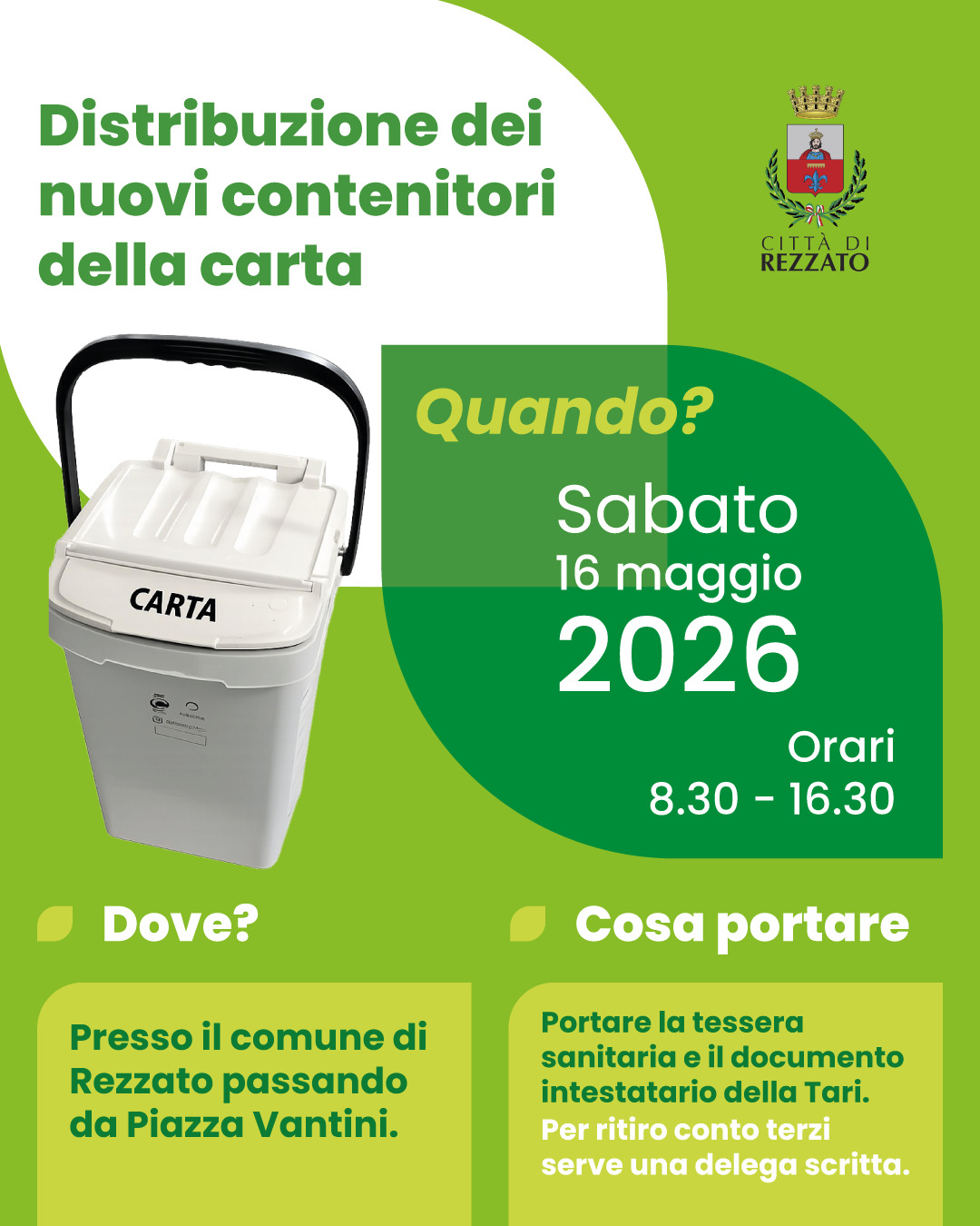 Il giorno 16 maggio dalle ore 8,30 alle ore 16,30 sarà possibile ritirare presso il Municipio (ingresso piazza Vantini) il contenitore della carta, obbligatorio per tutte le utenze domestiche dal 1 gennaio 2027.