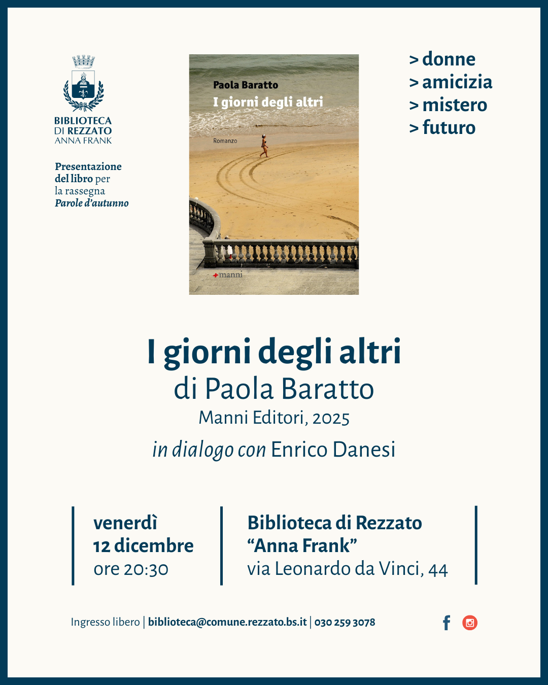 La Biblioteca di Rezzato "Anna Frank" ha il piacere di ospitare la presentazione del libro nell'ambito della rassegna "Parole d'autunno".